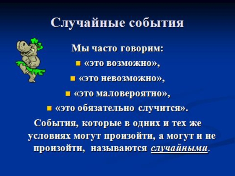 «случайное событие», «невозможное событие», а также «очень вероятное событие» и «маловероятное событие».