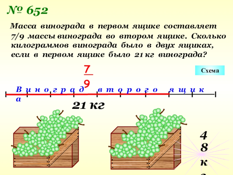 Масса винограда в первом ящике составляет 7/9 массы винограда во втором ящике. Сколько килограммов винограда было в двух ящиках, если в первом ящике было 21 кг винограда?