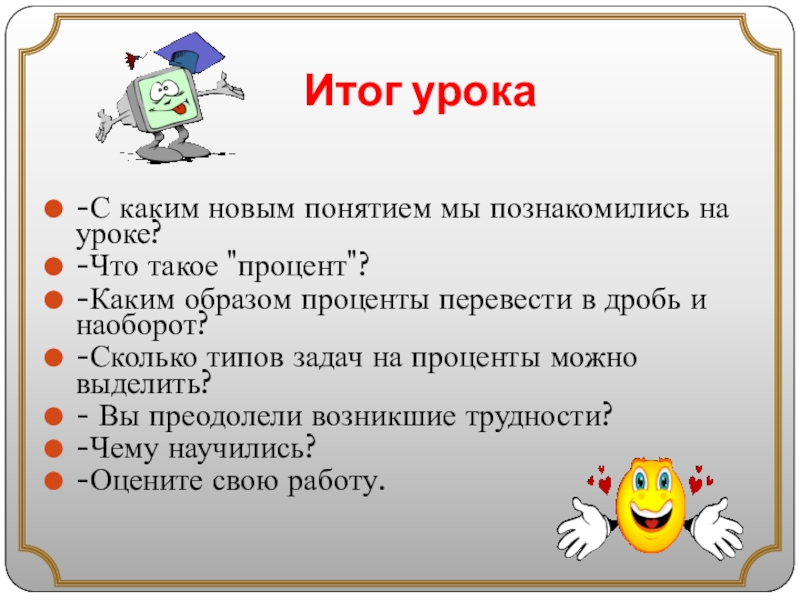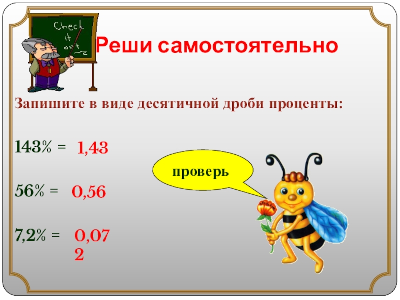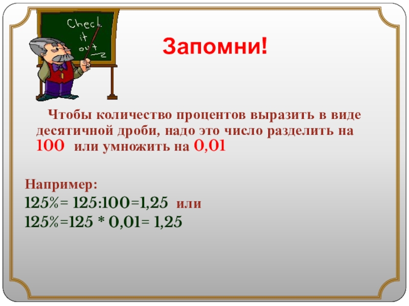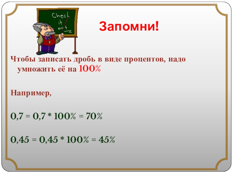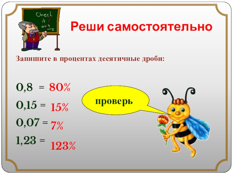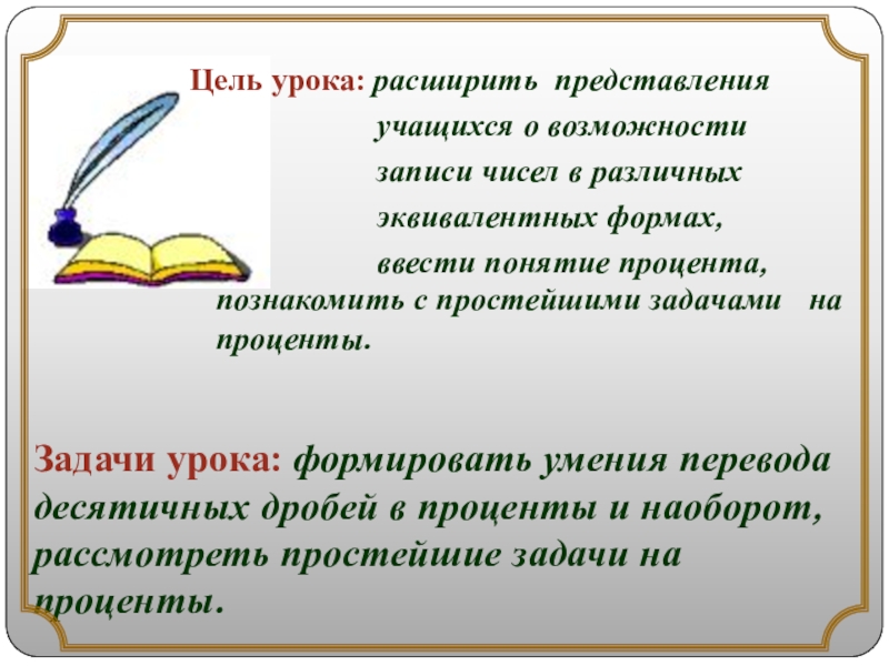 Задачи урока: формировать умения перевода десятичных дробей в проценты и наоборот, рассмотреть простейшие задачи на проценты.