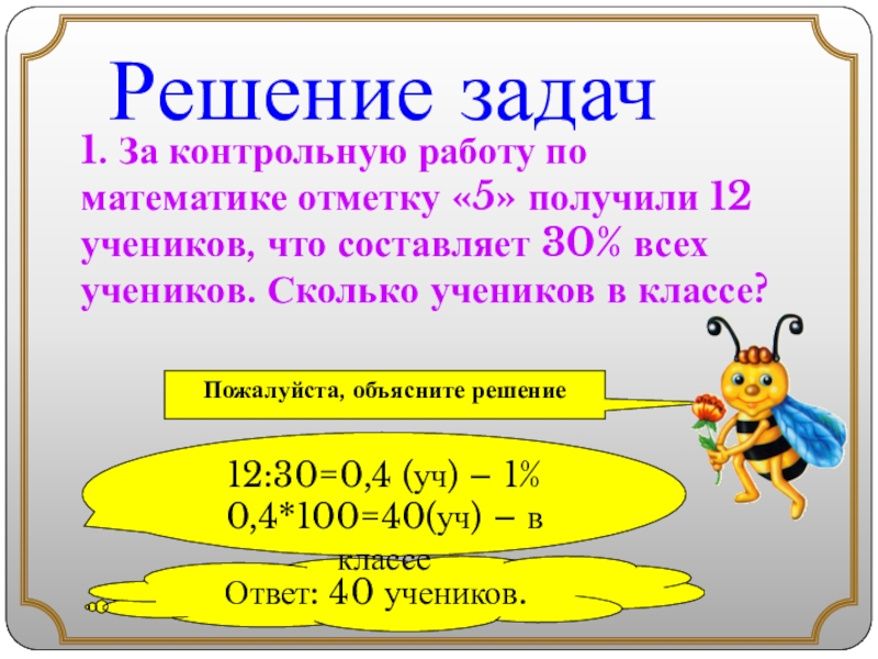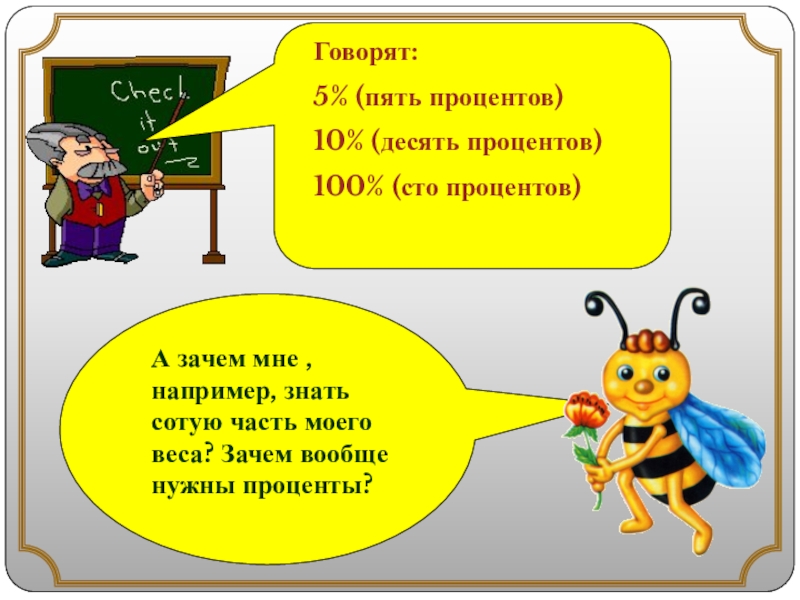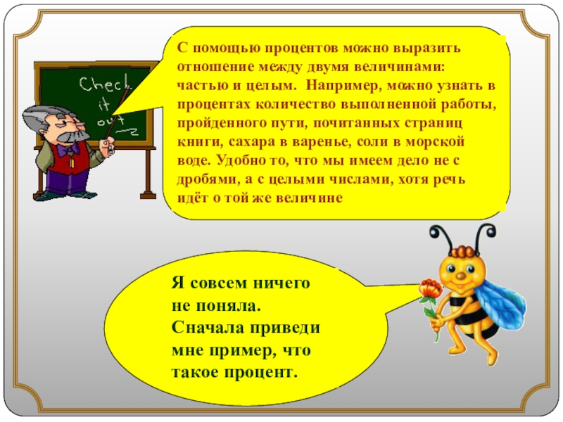 Я совсем ничего не поняла. Сначала приведи мне пример, что такое процент.