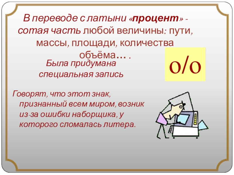 В переводе с латыни «процент» - сотая часть любой величины: пути, массы, площади, количества объёма… .