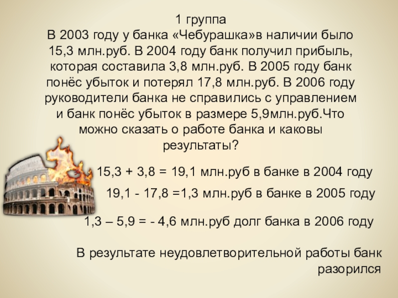 1,3 – 5,9 = - 4,6 млн.руб долг банка в 2006 году