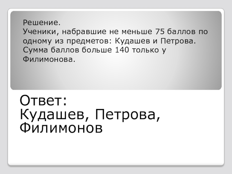 Похвальные грамоты дают тем школьникам, у кого сумма баллов за оба предмета больше 140 или хотя бы по одному предмету набрано не менее 75 баллов. Укажите фамилии учащихся 5В класса, получивших похвальные грамоты.