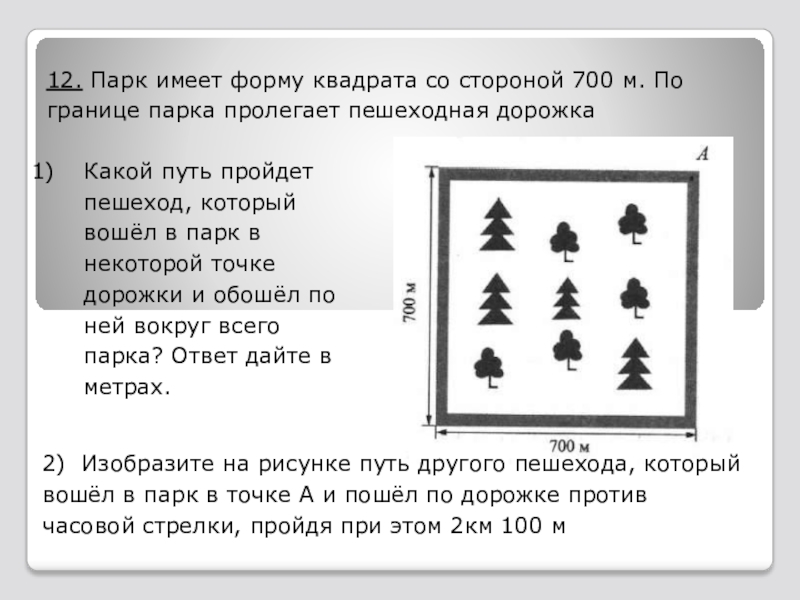 2) Изобразите на рисунке путь другого пешехода, который вошёл в парк в точке А и пошёл по дорожке против часовой стрелки, пройдя при этом 2км 100 м