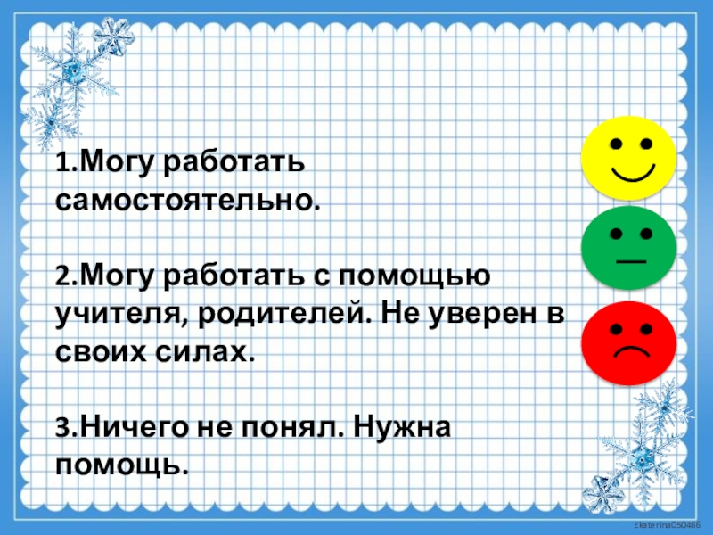 1.Могу работать самостоятельно. 2.Могу работать с помощью учителя, родителей. Не уверен в своих силах.3.Ничего не понял. Нужна
