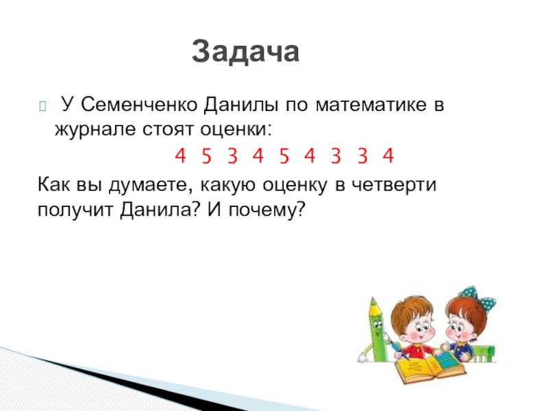 За домашнюю работу ты получил оценку «5», а я – оценку «1», складываем 5 и 1, делим на 2, получаем 3. Получается, что каждый получил по тройке.
