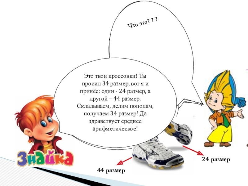 Это твои кроссовки! Ты просил 34 размер, вот я и принёс: один - 24 размер, а другой – 44 размер. Складываем, делим пополам, получаем 34 размер! Да здравствует среднее арифметическое!
