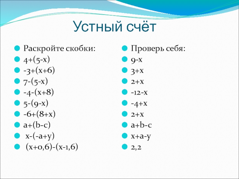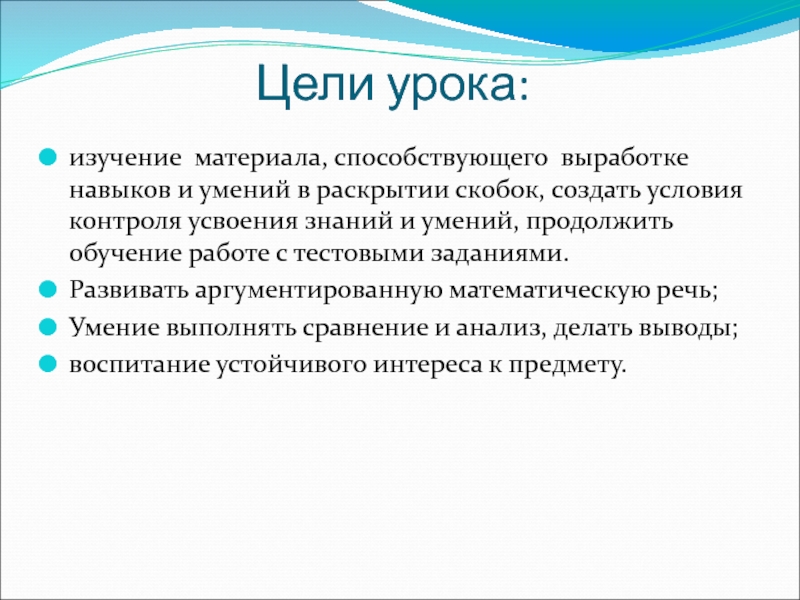 изучение материала, способствующего выработке навыков и умений в раскрытии скобок, создать условия контроля усвоения знаний и умений, продолжить обучение работе с тестовыми заданиями.