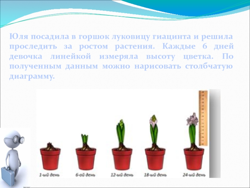 Слайд 2Юля посадила в горшок луковицу гиацинта и решила проследить за ростом