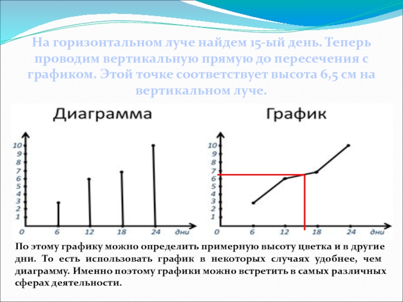 и диаграмма, показывает, как изменялась высота растения. Но есть очень важное различие графика и диаграммы. По диаграмме не видна высота растения на 15-ый день. А по графику её возможно определить.