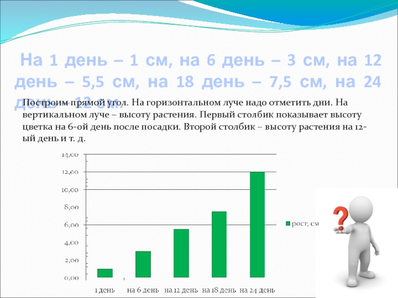 Построим прямой угол. На горизонтальном луче надо отметить дни. На вертикальном луче – высоту растения. Первый столбик показывает высоту цветка на 6-ой день после посадки. Второй столбик – высоту растения на 12-ый день и т. д.