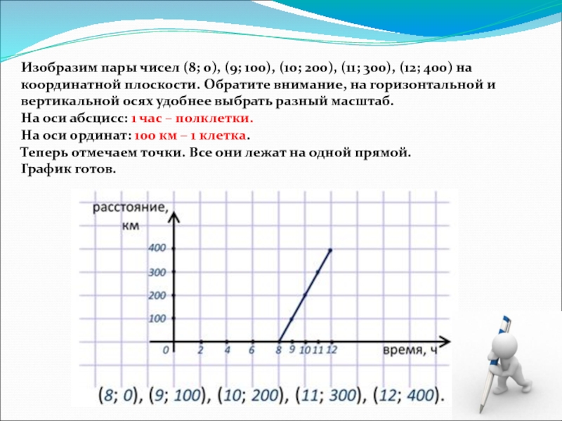 Изобразим пары чисел (8; 0), (9; 100), (10; 200), (11; 300), (12; 400) на координатной плоскости. Обратите
