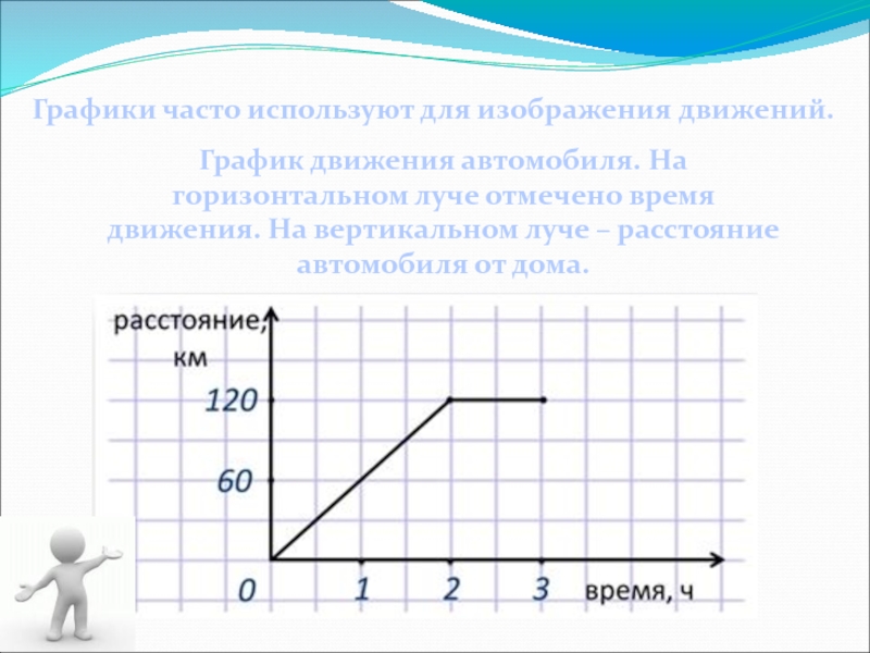 Графики часто используют для изображения движений.График движения автомобиля. На горизонтальном луче отмечено время движения. На вертикальном луче