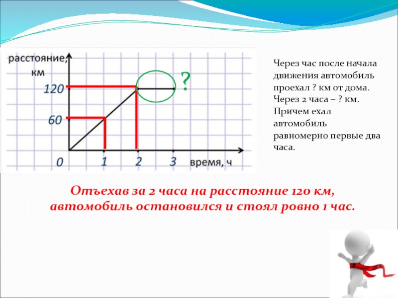 Через 2 часа – ? км. Причем ехал автомобиль равномерно первые два часа.