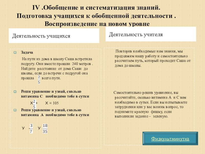 Самостоятельно решив уравнение, вы рассчитайте, сколько витамина А и С вам необходимо в сутки. Если вы испытываете затруднения или у вас возник вопрос, то поднимите красную фишку, если выполнили задание – зеленую.