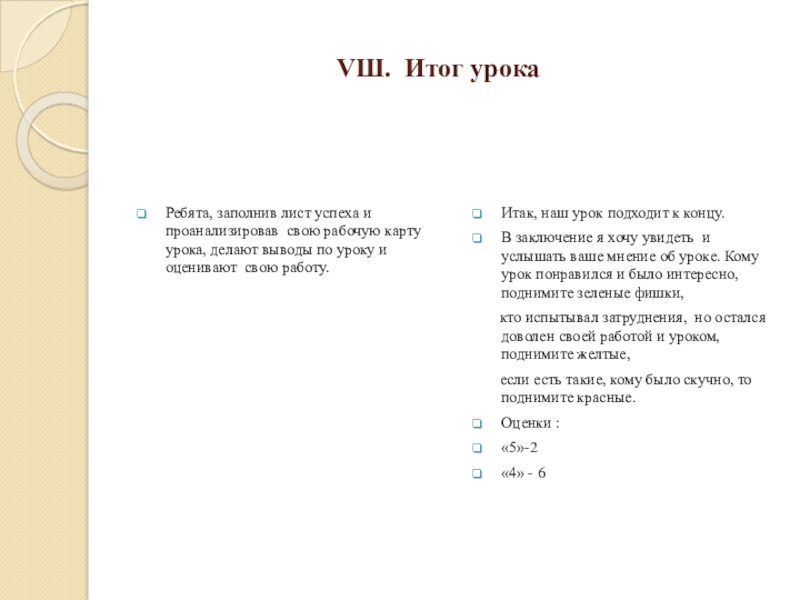 В заключение я хочу увидеть и услышать ваше мнение об уроке. Кому урок понравился и было интересно, поднимите зеленые фишки,