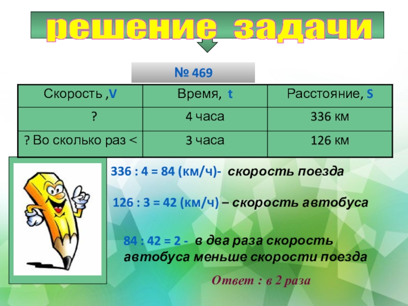 84 : 42 = 2 - в два раза скорость автобуса меньше скорости поезда
