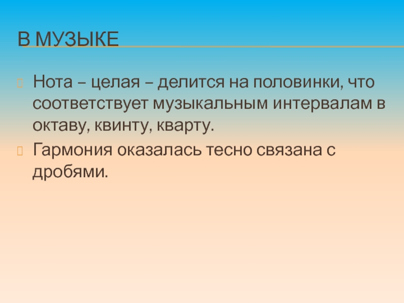 В МУЗЫКЕНота – целая – делится на половинки, что соответствует музыкальным интервалам в октаву, квинту, кварту.Гармония оказалась