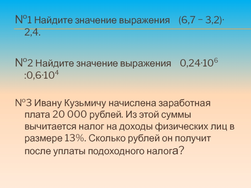 №1 Найдите значение выражения    (6,7 − 3,2)· 2,4.№2 Найдите значение выражения    0,24·106 :0,6·104№3 Ивану Кузьмичу