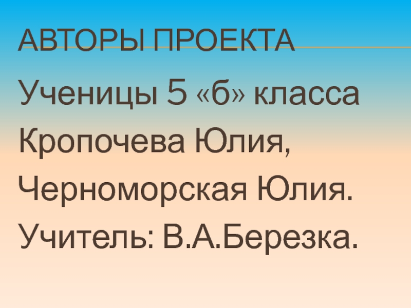 Авторы проектаУченицы 5 «б» классаКропочева Юлия,Черноморская Юлия.Учитель: В.А.Березка.