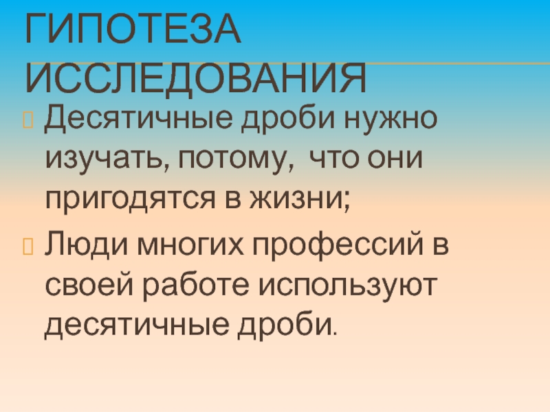 Гипотеза исследованияДесятичные дроби нужно изучать, потому, что они пригодятся в жизни;Люди многих профессий в своей работе используют
