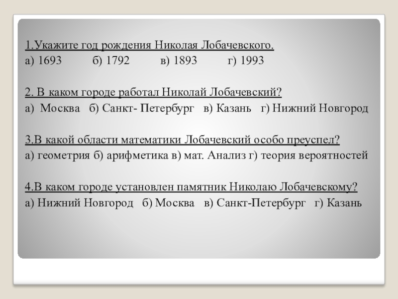 1.Укажите год рождения Николая Лобачевского.а) 1693     б) 1792     в)