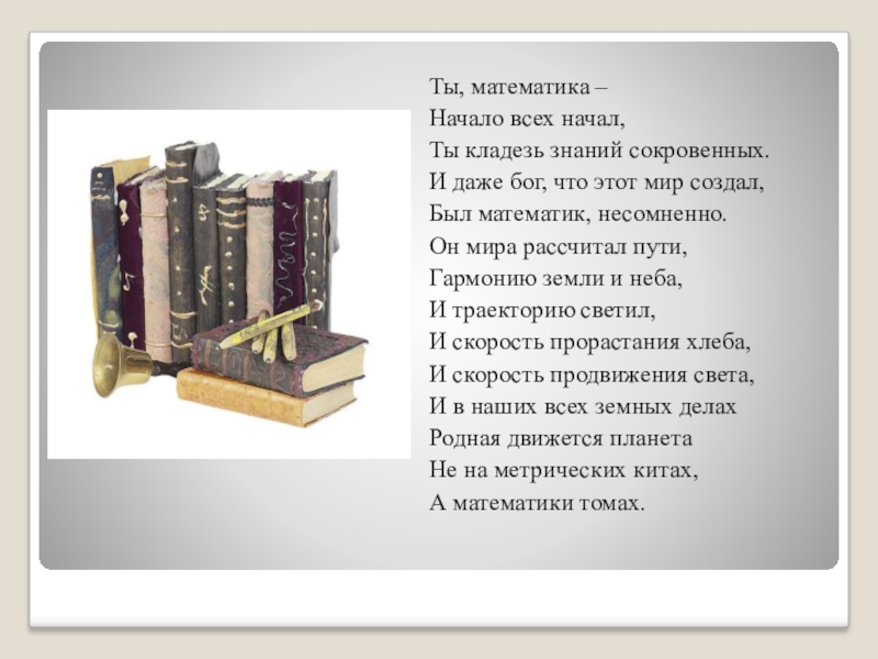 Ты, математика –Начало всех начал,Ты кладезь знаний сокровенных.И даже бог, что этот мир создал, Был математик, несомненно.Он