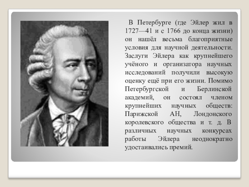 В Петербурге (где Эйлер жил в  1727—41 и с 1766 до конца жизни) он