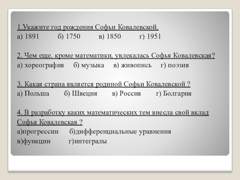 1.Укажите год рождения Софьи Ковалевской.а) 1891     б) 1750     в)
