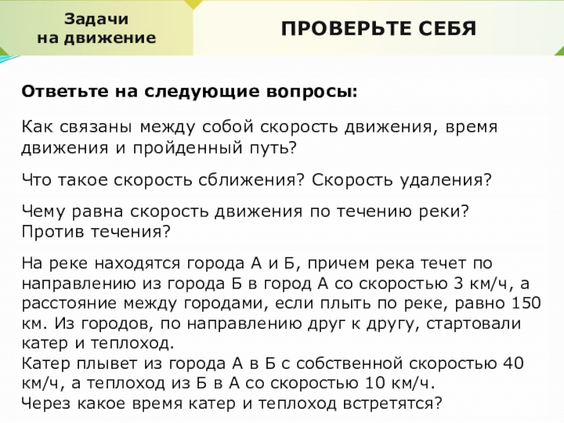 На реке находятся города А и Б, причем река течет по направлению из города Б в город А со скоростью 3 км/ч, а расстояние между городами, если плыть по реке, равно 150 км. Из городов, по направлению друг к другу, стартовали катер и теплоход.