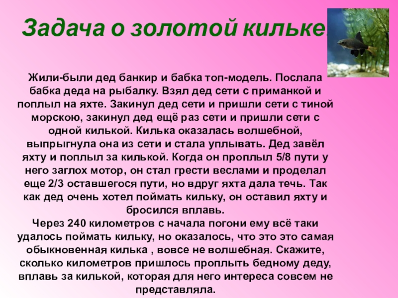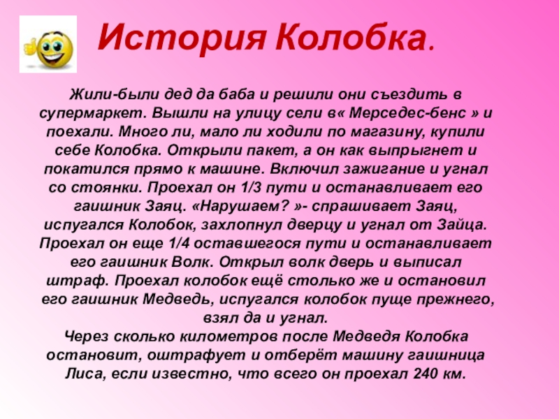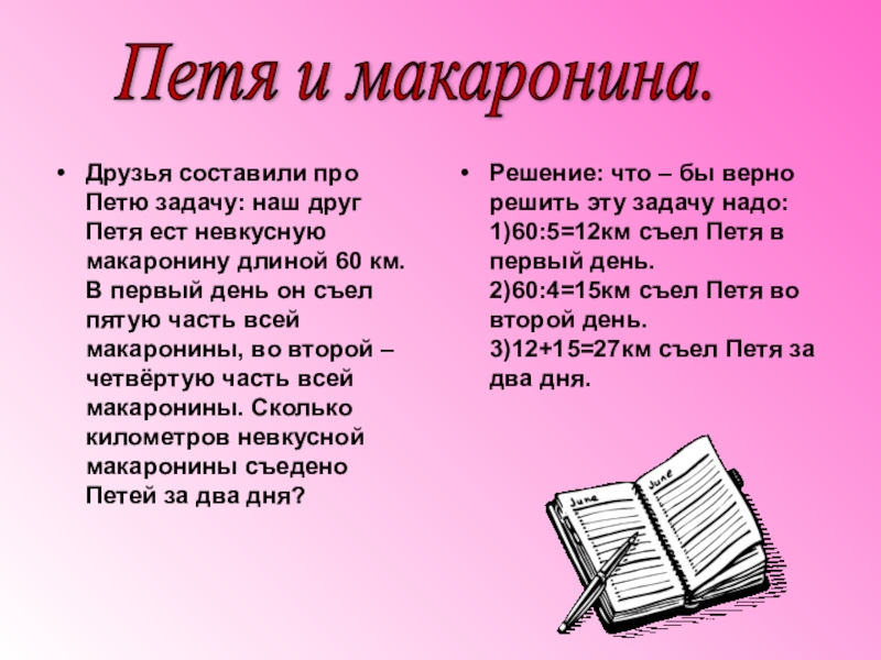 Решение: что – бы верно решить эту задачу надо: 1)60:5=12км съел Петя в первый день. 2)60:4=15км съел Петя во второй день. 3)12+15=27км съел Петя за два дня.