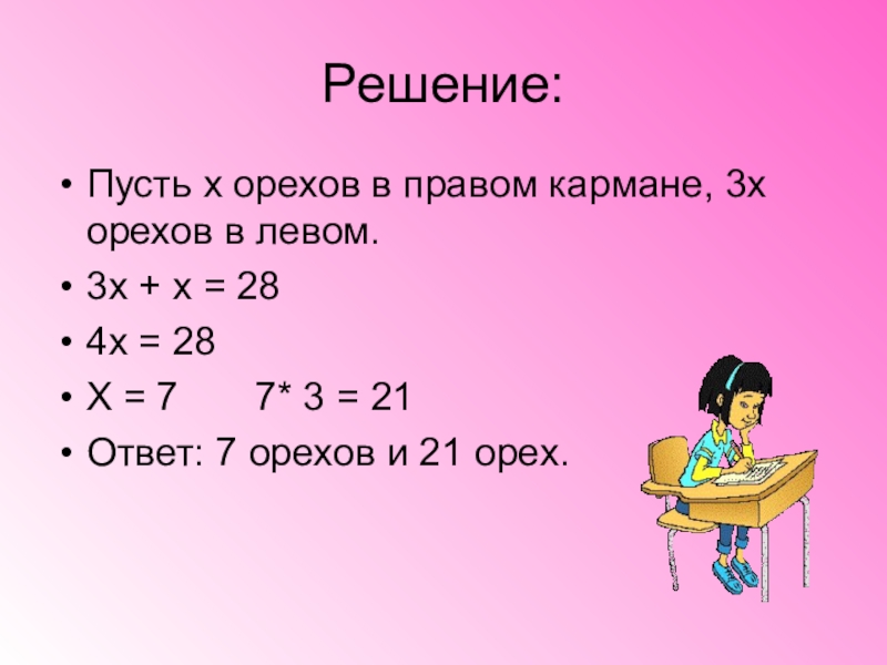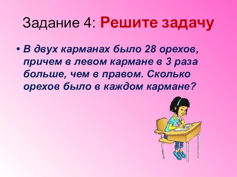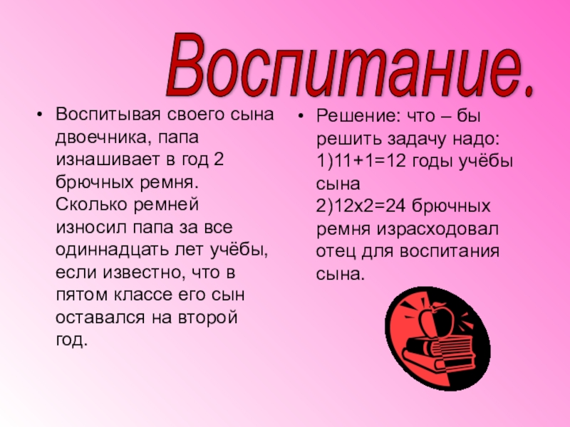Решение: что – бы решить задачу надо: 1)11+1=12 годы учёбы сына 2)12х2=24 брючных ремня израсходовал отец для воспитания сына.