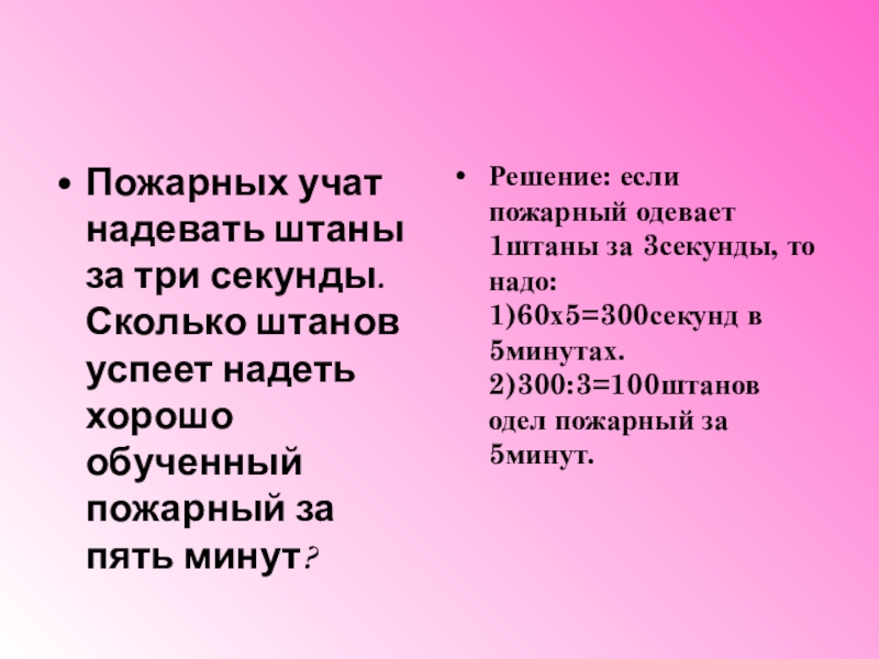 Решение: если пожарный одевает 1штаны за 3секунды, то надо: 1)60х5=300секунд в 5минутах. 2)300:3=100штанов одел пожарный за 5минут.