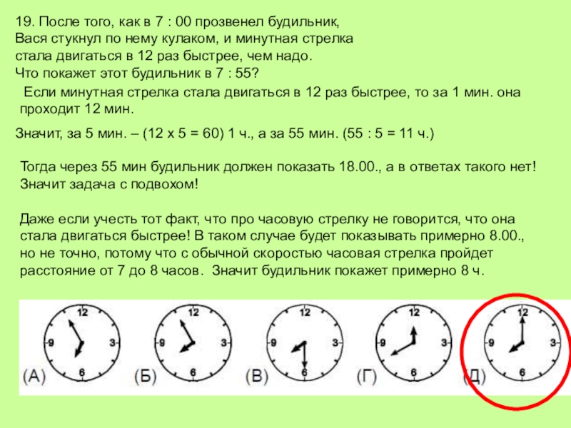 Значит, за 5 мин. – (12 х 5 = 60) 1 ч., а за 55 мин. (55 : 5 = 11 ч.)