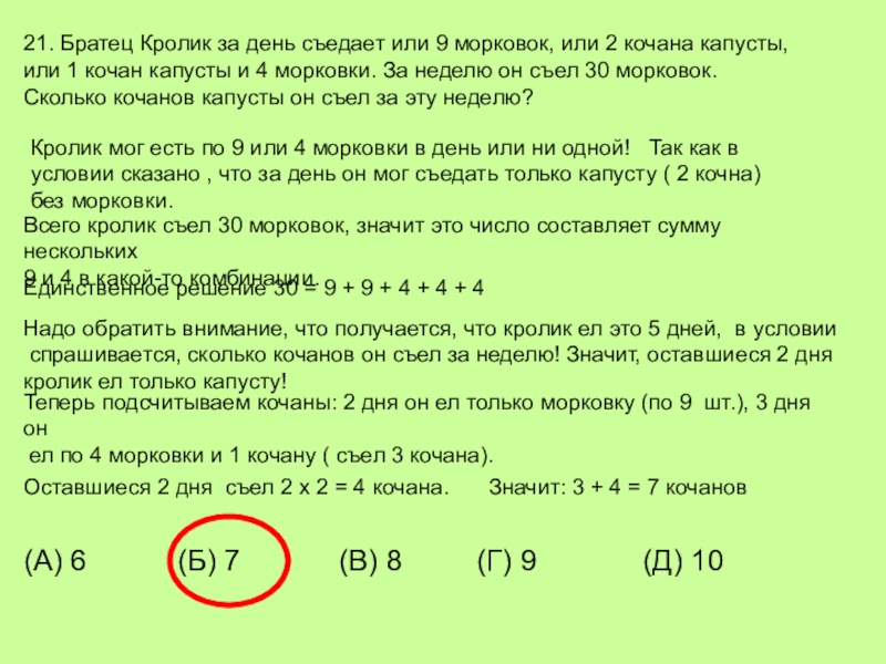 Теперь подсчитываем кочаны: 2 дня он ел только морковку (по 9 шт.), 3 дня он