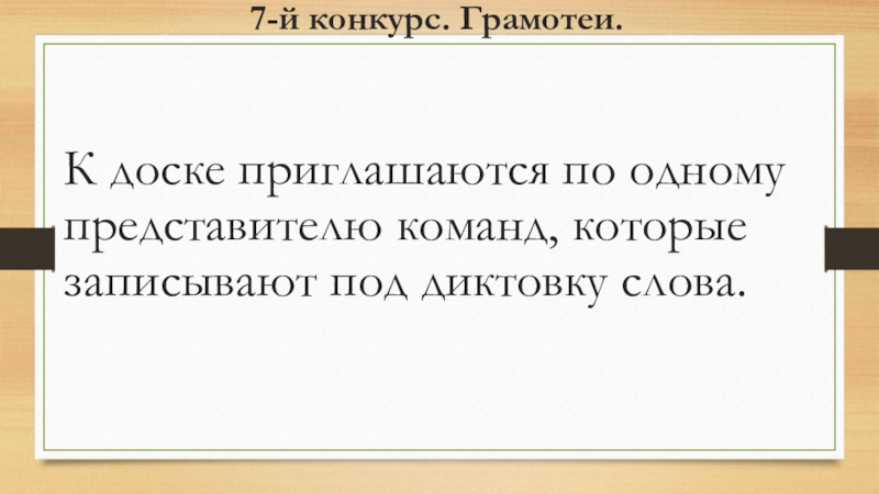 7-й конкурс. Грамотеи.К доске приглашаются по одному представителю команд, которые записывают под диктовку слова.