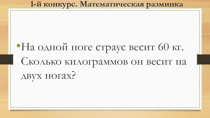 1-й конкурс. Математическая разминкаНа одной ноге страус весит 60 кг. Сколько килограммов он весит на двух ногах?