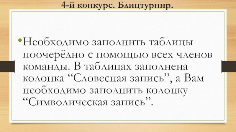 4-й конкурс. Блицтурнир.Необходимо заполнить таблицы поочерёдно с помощью всех членов команды. В таблицах заполнена колонка “Словесная запись”,