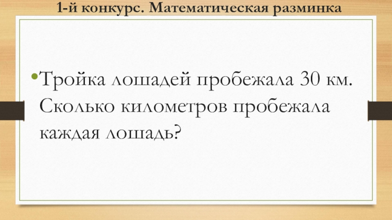 1-й конкурс. Математическая разминкаТройка лошадей пробежала 30 км. Сколько километров пробежала каждая лошадь?