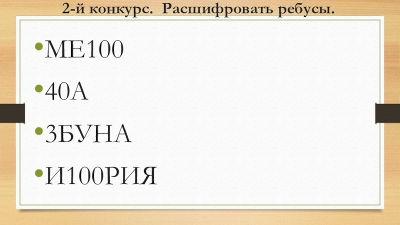 2-й конкурс. Расшифровать ребусы.МЕ100 40А3БУНА И100РИЯ