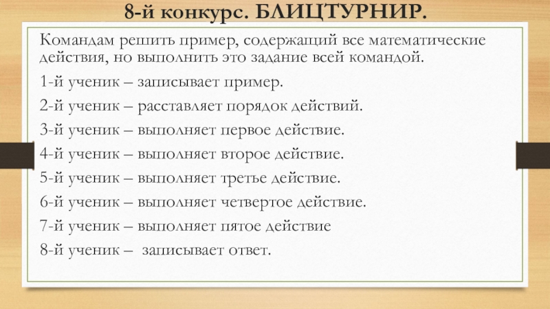 8-й конкурс. БЛИЦТУРНИР.Командам решить пример, содержащий все математические действия, но выполнить это задание всей командой.1-й ученик –