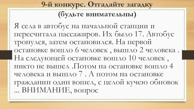 9-й конкурс. Отгадайте загадку  (будьте внимательны) Я села в автобус на начальной станции и пересчитала пассажиров.