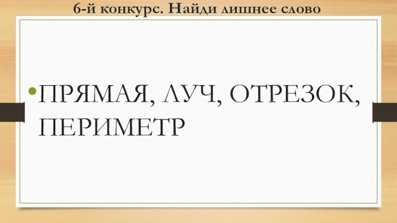 6-й конкурс. Найди лишнее словоПРЯМАЯ, ЛУЧ, ОТРЕЗОК, ПЕРИМЕТР