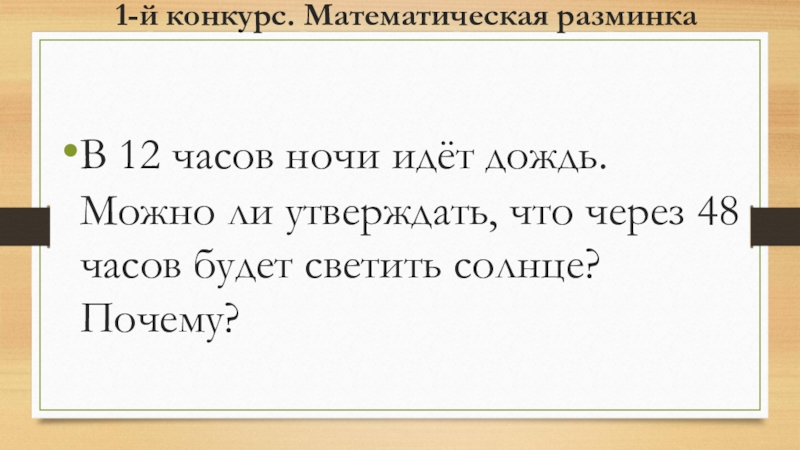 1-й конкурс. Математическая разминкаВ 12 часов ночи идёт дождь. Можно ли утверждать, что через 48 часов будет