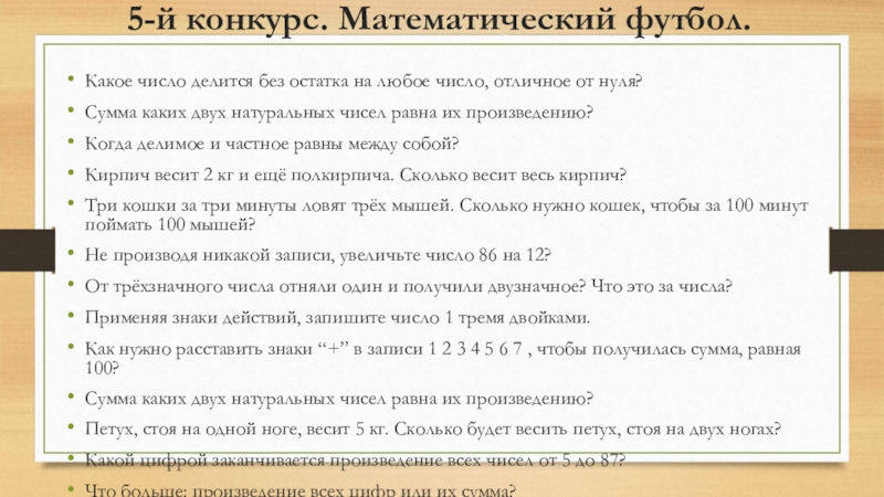 5-й конкурс. Математический футбол.Какое число делится без остатка на любое число, отличное от нуля?Сумма каких двух натуральных