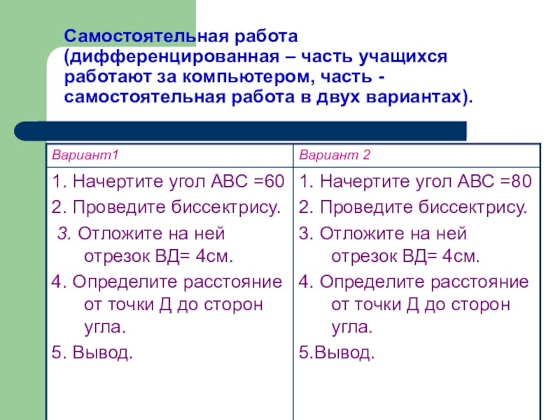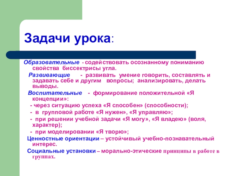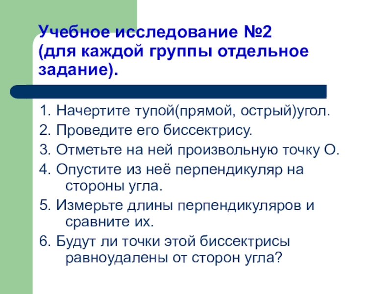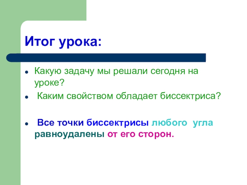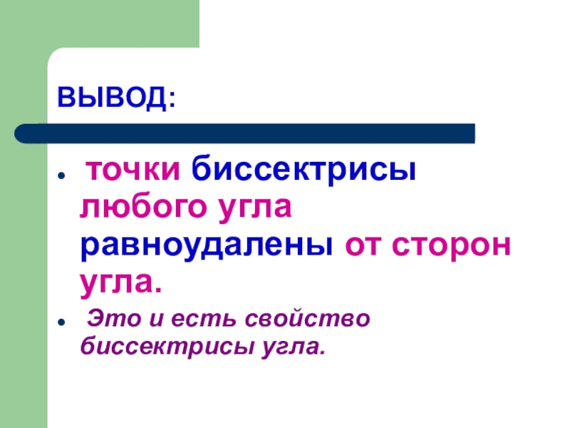 - Биссектриса угла (вместе с её продолжением) есть геометрическое место точек, равноудалённых от сторон угла (или их продолжений).