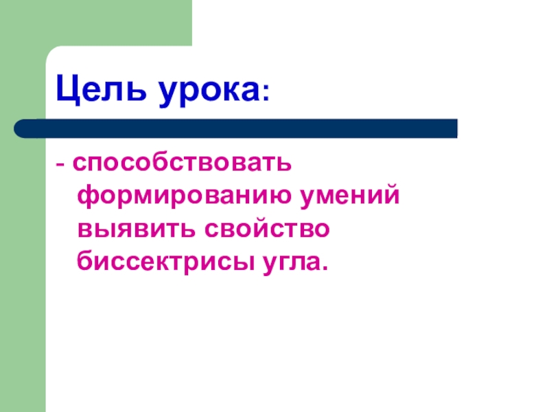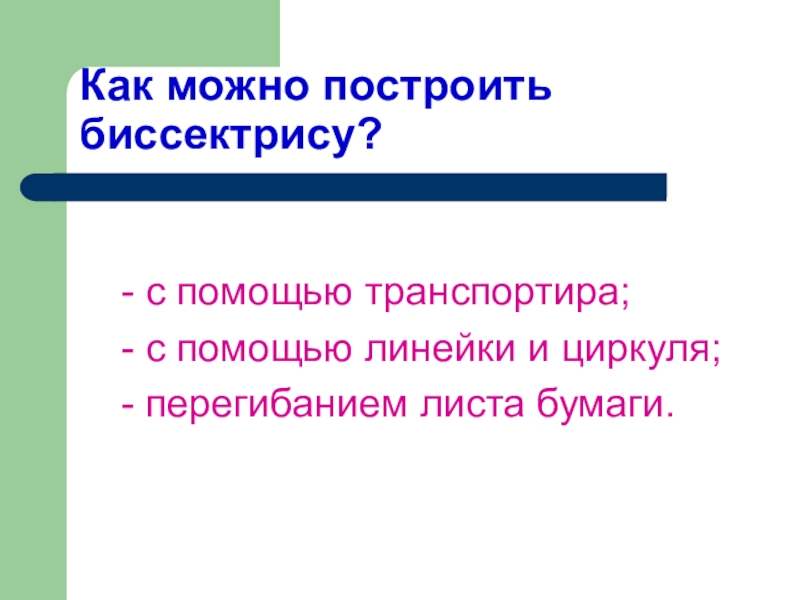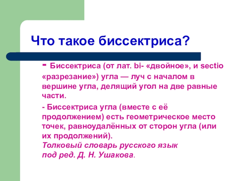 - Биссектриса (от лат. bi- «двойное», и sectio «разрезание») угла — луч с началом в вершине угла, делящий угол на две равные части.