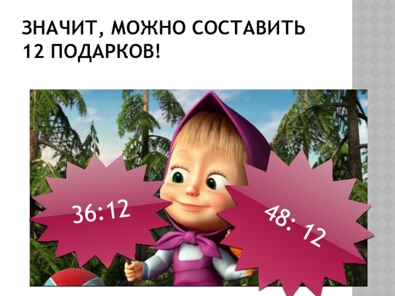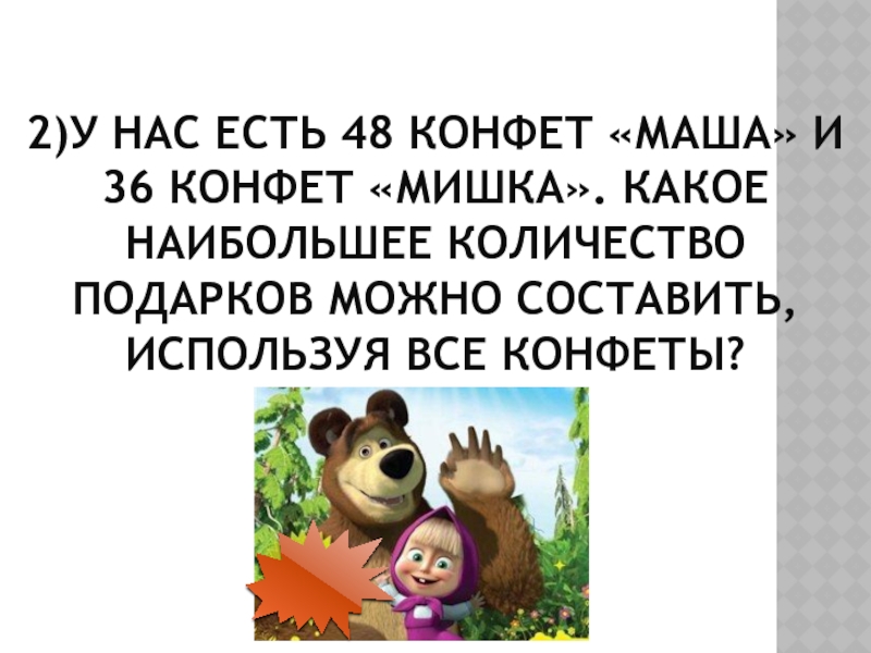 Слайд 112)У нас есть 48 конфет «Маша» и 36 конфет «Мишка». Какое