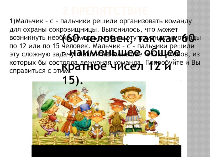сокровищницы. Выяснилось, что может возникнуть необходимость разбить эту команду на отряды по 12 или по 15 человек. Мальчик – с – пальчики решили эту сложную задачу: нашли наименьшее число членов, из которых бы состояла дежурная команда. Попробуйте и Вы справиться с этим.