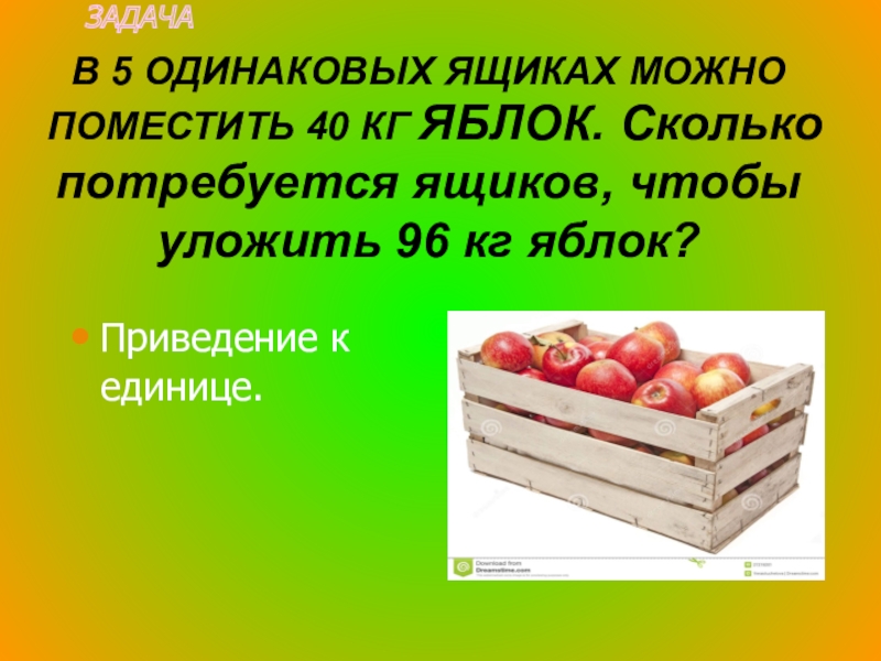 В 5 ОДИНАКОВЫХ ЯЩИКАХ МОЖНО ПОМЕСТИТЬ 40 КГ ЯБЛОК. Сколько потребуется ящиков, чтобы уложить 96 кг яблок?
